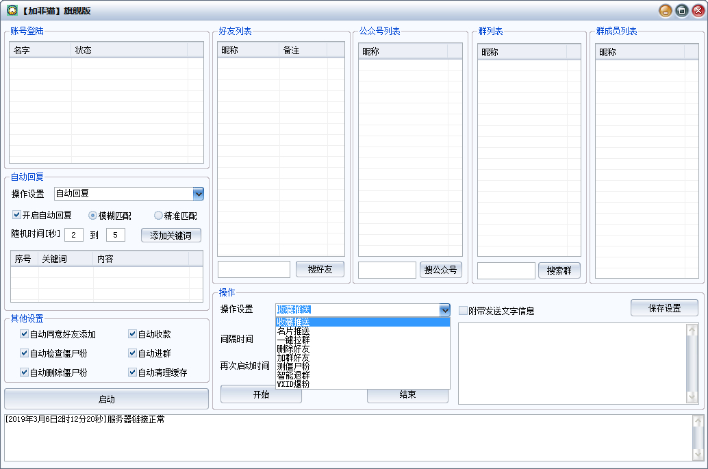 这是推送名片的一个衍生功能,就是说你把所有的好友名片,全部推送给一个好友,而这个好友收到名片之后,利用加菲猫的自动接收名片功能,一个一个添加为好友。这就是一个变相的好友克隆功能。