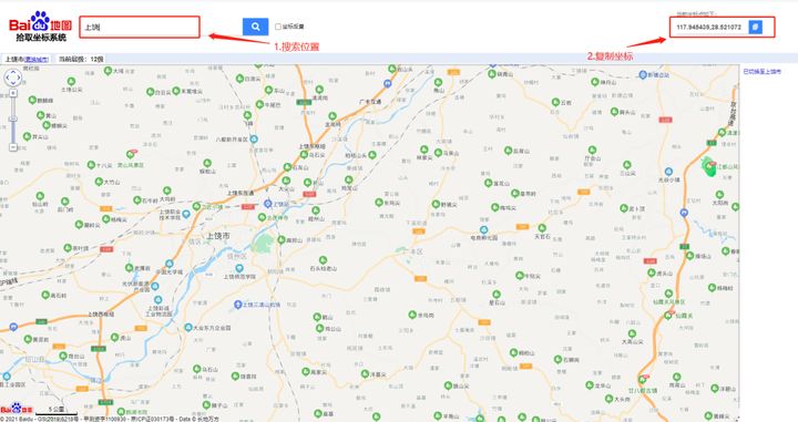 2.随后百度搜索【百度地图拾取坐标系统】,打开后输入你想改的地区地址,随后复制右上角的坐标参数。
