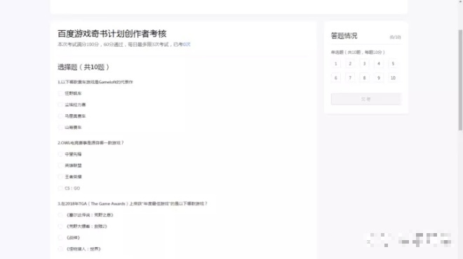 接下来就是创作者考核,总共10题,满分100分,满60分就算及格,我本身对游戏就是菜鸡,所以百度就是我的神助力了。。。