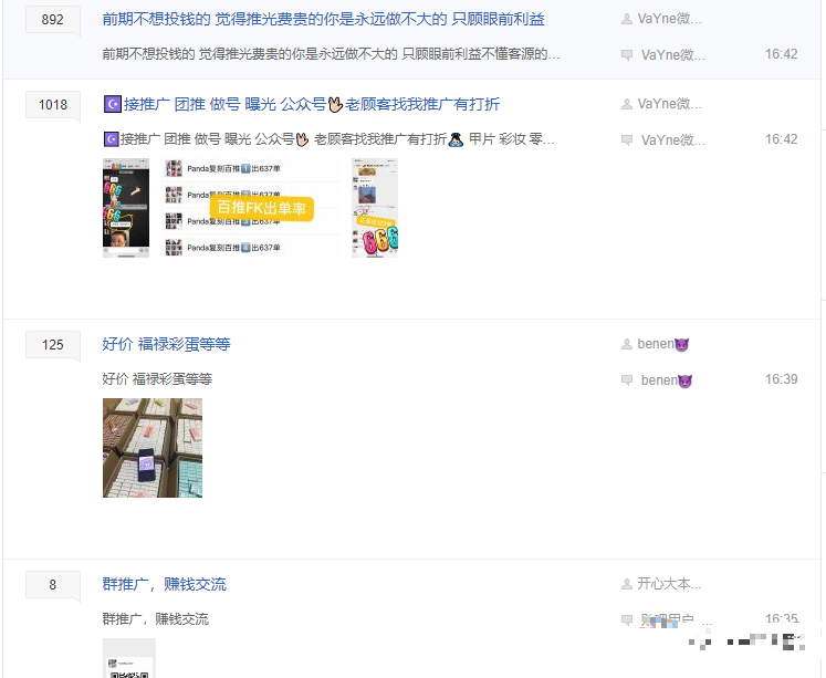 细节决定成败,这里需要注意三点,①这种帖子有时效性,如果前面十几楼都是微信号,后面会很少有人留微信,所以在前面微信号记录好以后,就把前面的内容删掉,留5个左右即可,如果帖子被顶下去了,可以自己手动回帖。②留下的5楼每一个都必须给别人回复,可以简单回复个已加请通过,增加活跃度和信任度。③如果没人回帖,就自己用小号留下自己的微信号,自己打造一下帖子。