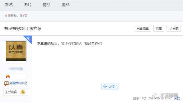 当然也可以主动发帖,比如在项目吧发布求项目的帖子,留下联系方式,让别人主动加你,这样加的人更多。不至于微信会有屏蔽的风险。