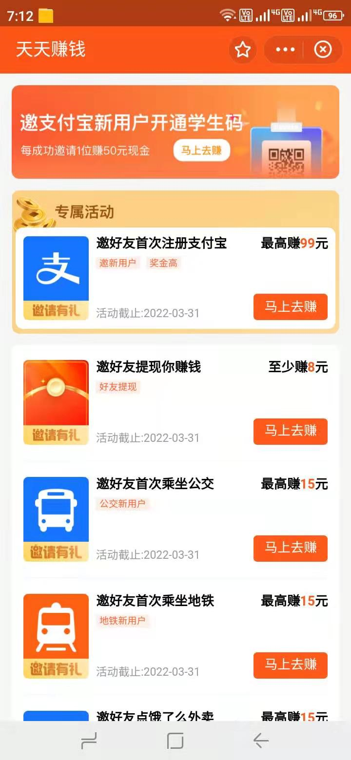 邀好友用飞猪旅行点我前往在哪里获取到这些官方拉新业务?首先第一步扫码下载支付宝第二步:在支付宝首页搜索框搜索天天赚钱-邀请有礼进入官方拉新页面下面是进入活动拉新界面的界面图